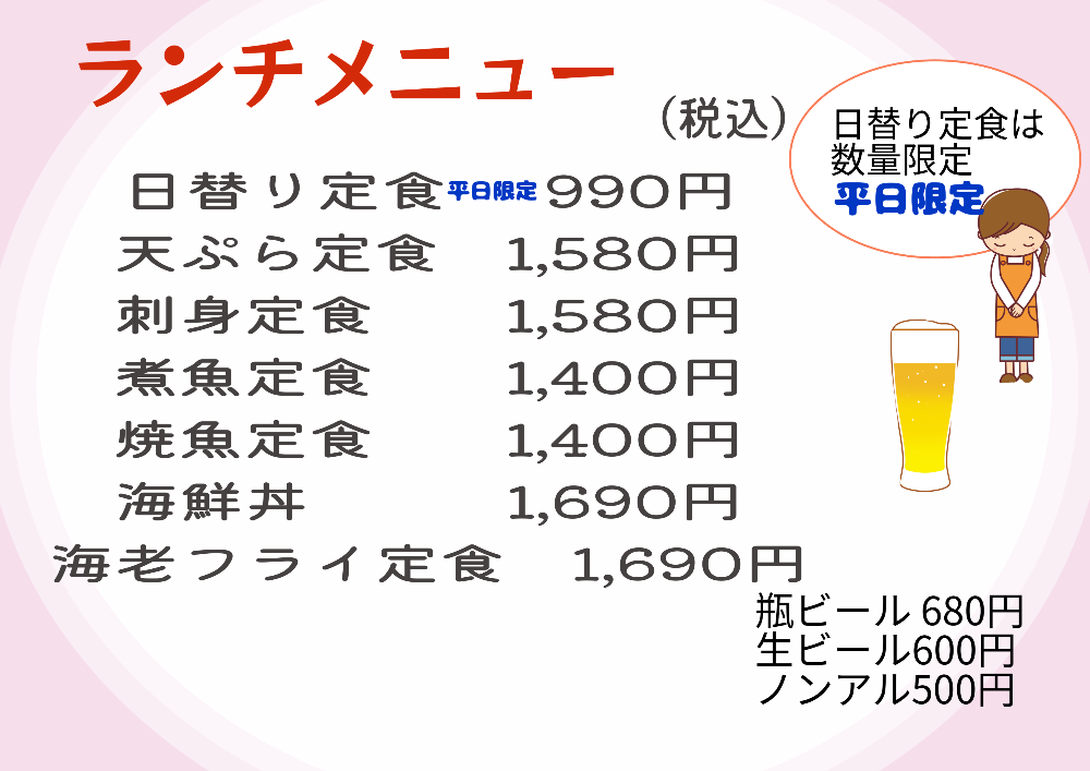 メニューは「魚」を中心にした定食と海鮮丼、天ぷら定食です。但し、海の状況によりメニューの変更があります。