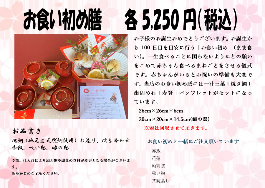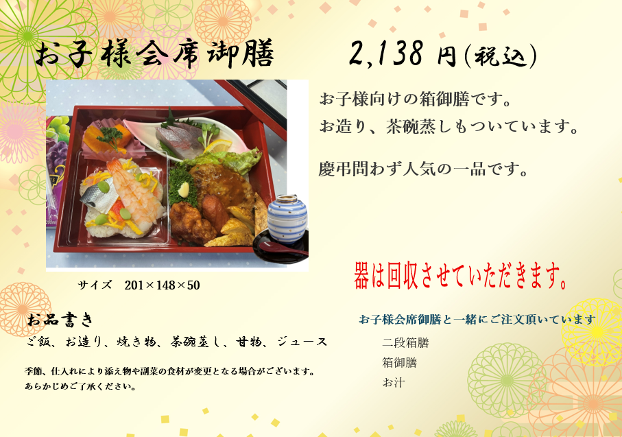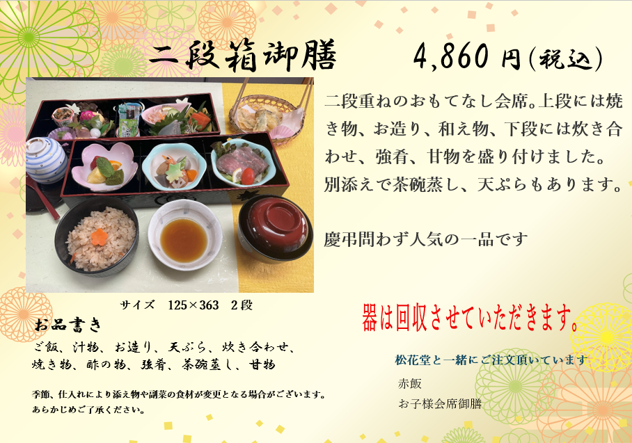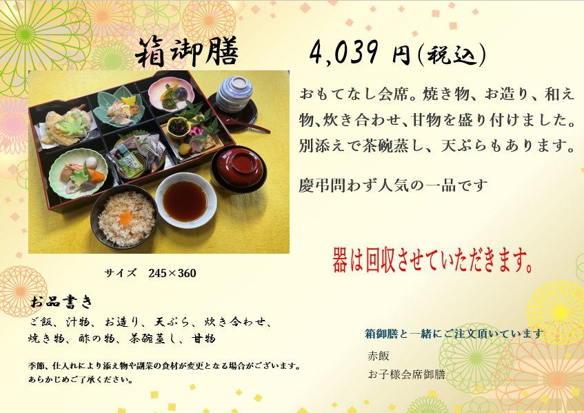 地域の会食、法要、慶事など自宅での会食などいろいろなシーンでご利用ください。