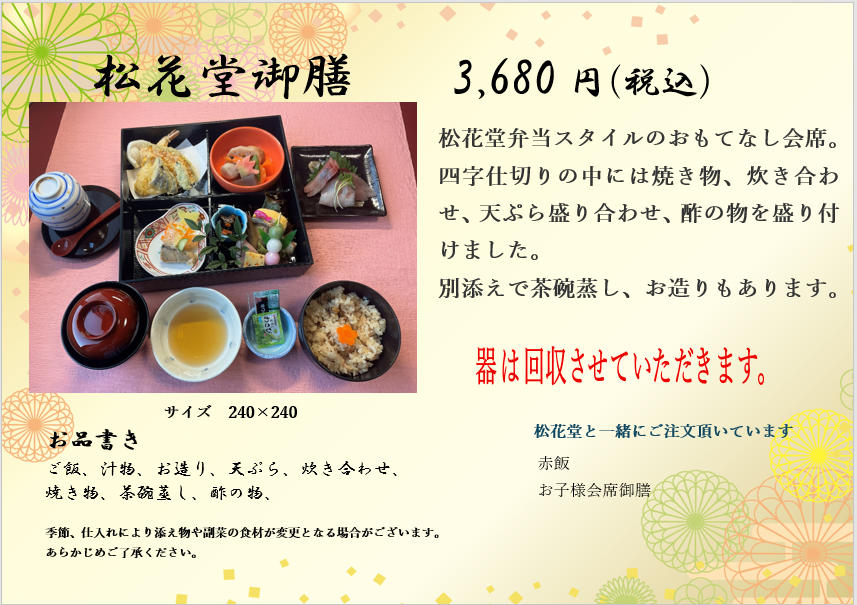器を回収させていただく商品。商品に温かい茶碗蒸し、汁物が付属しているものもあります。