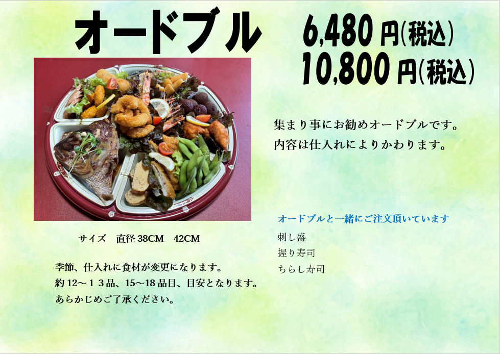オードブル、刺し盛り(刺し盛りは天候、漁期によりお受けできない場合がございます)握り寿司、
