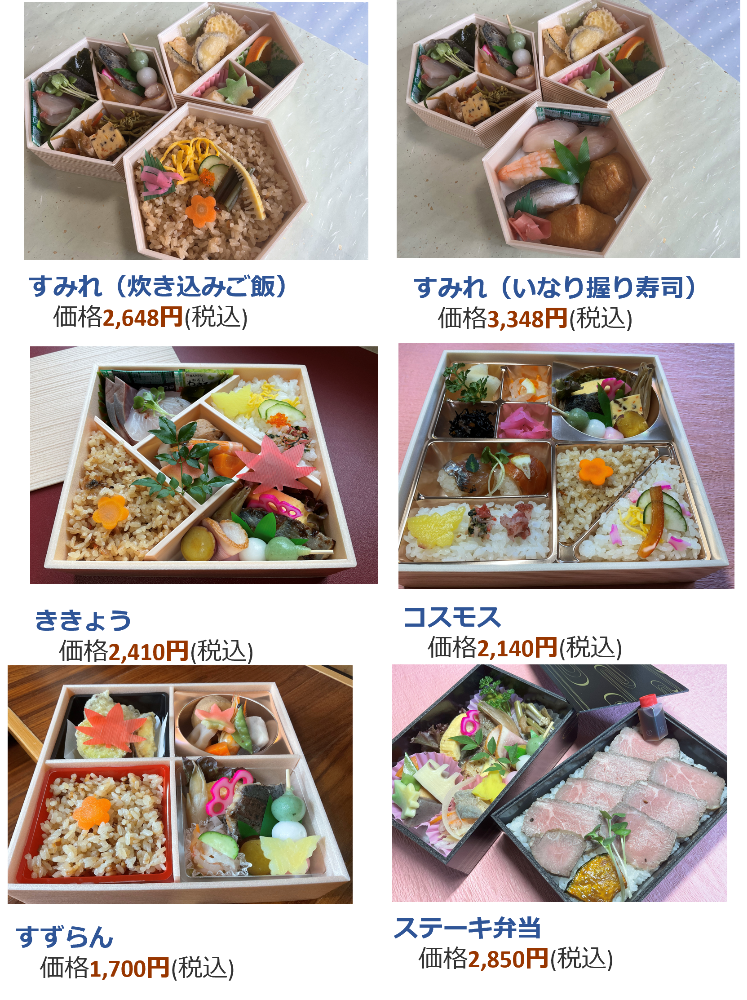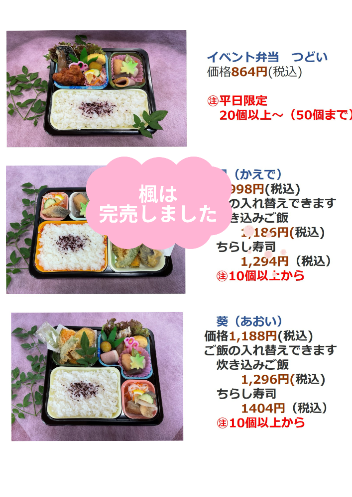 お手頃価格のお弁当3品です。器の数に限りがあり終了次第完売となります。